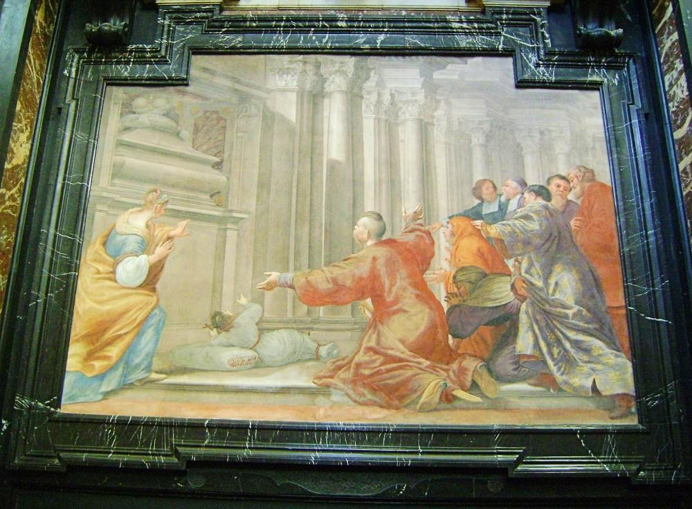 Fresk z kaplicy św. Kazimierza w Katedrze Wileńskiej obrazujący wskrzeszenie martwej dziewczynki u grobu królewicza Kazimierza.